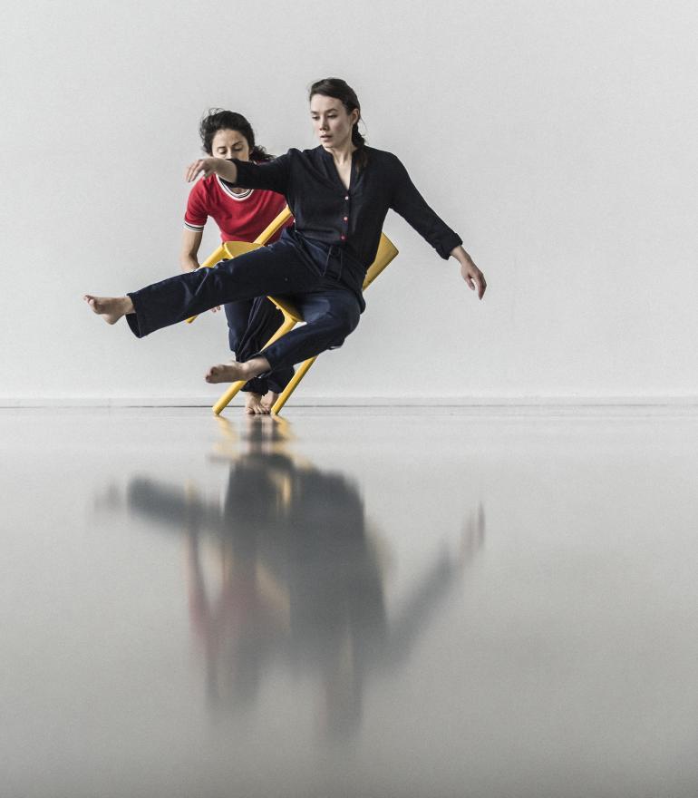 Billed as “three dancers and a DJ” this does exactly what was expected of it. The three female dancers are dressed in tracksuit bottoms and t-shirts. There are also three white chairs on stage, which the performers return to when they are not dancing. The DJ in question is Robbie Kitt (brother of David Kitt) who has worked as a DJ and musician in Ireland for many years. He is positioned at the front of the stage with his back to the audience. He uses a variety of electronic devices to control our audio experience. Those expecting two turntables will be disappointed as it is a purely electronic feast! The walls of the Lir studio one are exposed and there is no hint of a set in this stripped back performance.