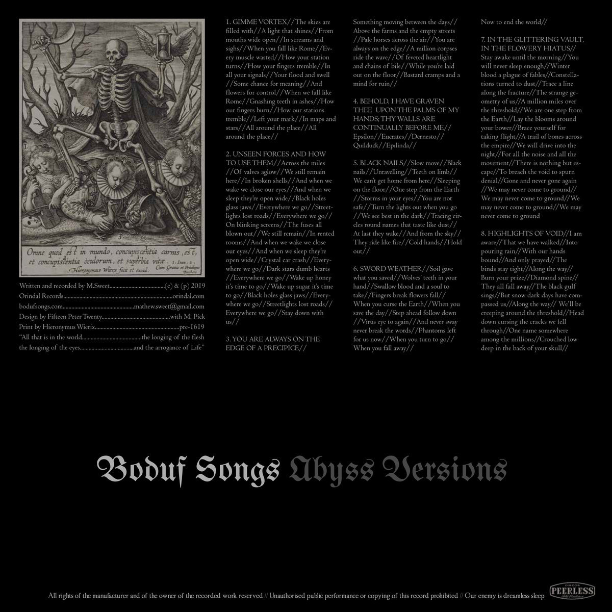 The seventh album from American artist Mat Sweet, recording as the oddly named Boduf Songs. It arrives nearly five years after the last one. An album entitled Abyss Versions and references to a precipice and a void signals a move in a bleaker direction. Gimme Vortex gives a good impression of the rest of the album, Sweet’s breathy, whispery vocals over subtle, creeping melodies picked out painstakingly on electric guitars. Unseen Forces and How To Use Them adds hushed percussion, and You Are Always On The Edge of a Precipice focuses more on keyboards, but the overall effect remains consistent. Behold… opens with a bass playing a low foreboding note, some strange creaking noises and very little else, and this continues for three and a half minutes. Songs don’t seem to be ‘played’, the likes of Black Nails and Sword Weather ooze out of their grimy hole, pouring pleasant darkness slowly into your ears.