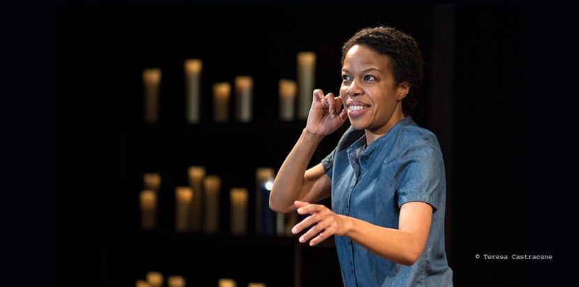The central point of this play is Evelyn’s daughter, she can’t talk and she can’t breathe, relying on her respirator and Sun’s nuanced physicality to bring her to life. Much as the daughter relies on her life saving device, we as an audience are also reliant on this particular plot point to hold a scattered and at times thin narrative together. This downfall sadly undercuts otherwise sharp humour and dialogue which in large brush strokes touches at themes of class, motherhood, masculinity and race: “Who isn’t emotionally abusive in NYC?” or “What about those Taliban hotties?” questions a male friend wanting the dirt from Mani’s recent service in Iraq. Nilaja Sun as performer and writer is not afraid to address big issues in refreshingly ‘un PC’ quips from well wrought characters. Sadly, these same issues are unlovingly hung out to dry, unresolved as the storm when the storyline hit an unsatisfying climax in Pike Street. Meanwhile, we are left to weather our very own ‘storm Lorenzo’ as house lights come up signalling conclusion and the flickering candles of the backdrop flicker and ebb.