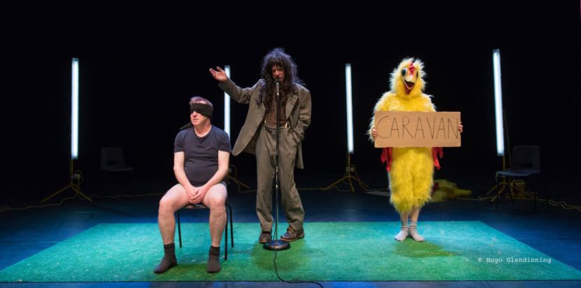 The three members of the cast emerge on stage in a variety of costumes. Jerry Killick is wearing a suit with a black curly wig. Claire Marshall is wearing a bright yellow chicken suit. The final member of the cast is Richard Lowdon, who is wearing a t-shirt and a pair of boxer shorts. They take their positions on the stage and the show starts.