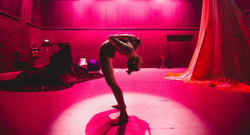 What was revealed was a single female figure, clad in a rhinestone-encrusted leotard, standing with her back to the audience holding aloft a substantial stone. To her left, seated at the side of the stage, were three figures enshrouded in different coloured cloths. The stage was filled with a variety of strangely shaped items, again covered by sheets.