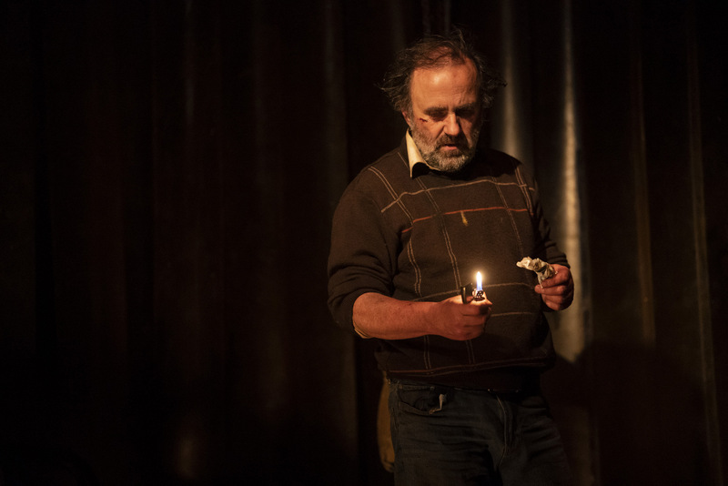 The play lasts just over an hour but much of the early segment is spent without words, with Donnelly in solitude as he paces the floor or moves sacks around the stage. Donnelly is a brutish and violent man who has just committed a terrible deed. We see the aftermath of his actions but also the physical impact it has on him, with scabs and scars on his face and arms. The story of his ancestor in some ways reflects his own tale and gives the audience an idea of who Francis is as a man. The tale is quite difficult to follow, as it’s told by the confused mind of Francis as he recovers from the scenes of violence. It asks much of the audience and you need to pay attention to grasp the complexities of the plot. The main point of interest is the performance of Cranitch who embodies this confused creature. We feel his anguish and terror, while also his visceral fear. He captures Francis’ state of panic perfectly and the intimacy of the space draws the audience into his world.