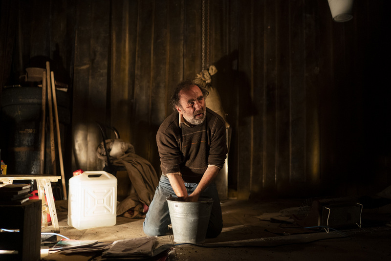 As the audience take their seats, Francis Donnelly (Lorcan Cranitch) is already on stage. He’s lying asleep on a pile of sacks containing some type of grain. He’s dressed in a ratty brown jumper and a pair of dirty jeans, along with a pair of wellies. The stage is filled with boxes, buckets and other odds and ends. Plastic sheeting blocks the back of the stage from sight. It is a representation of a barn, where our protagonist lies in wait. As the play starts in earnest, we are plunged into complete darkness. We hear the sounds of a scuffle taking place as someone has arrived to attack Donnelly. He meets them with force and wins the fight. When the lights come back on, the legs of the other individual are visible at one side of the stage, sticking out from under a pile of sacks. The fight is over and Donnelly has won, his opposition lying dead or dying.