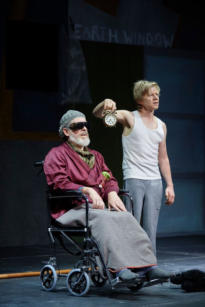 Aedin Cosgrove’s set has reduced the world to a single, stark, claustrophobic room, disorienting to look at, with an unseen kitchen offstage. Walls are reinforced with odd irregular-shaped planks and hoardings. Outside, the world is “full of corpses”. A rat and a flea are unhelpful intruders in the bunker-like space, otherwise inhabited by Hamm, a blind, manipulative tyrant, who cannot stand; his slave attendant, Clov, who cannot sit (and may be Hamm’s son) and Hamm’s parents, Nagg and Nell, who presumably can do neither, having lost their “shanks” in a road accident and now reside in their respective dustbins. The symbols are piling up.