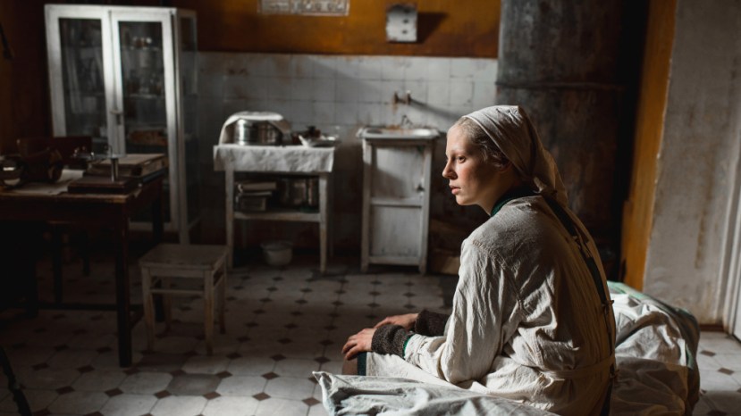 What is beautifully observed is the fact that because Leningrad is shattered those that have survived must live communally in cramped gloomy spaces which are very much the worse for wear. As regards washing, a memorable scene depicts many woman naked cleaning themselves in a large tiled wash room. Privacy has no standing in this community. Therefore, the creation of a specific new green dress is an event in itself. It is worn by Masha to a lunch which takes place exceptionally in a well ordered dining room with only four present… the hosts who are a well-heeled couple are the parents of a young man in whom Masha is interested. However, the “in ruins” motif dominates as is shown by the patients in the infirmary who are living evidence of the wreckage of war as they continue to exist with their catastrophic injuries. The options which they face are minimal as Balagov shows.