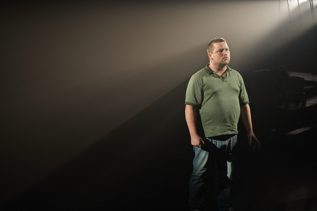 The staging is inventive with the carcass of a caravan visible on stage at the start of the performance. This is slowly dismantled during the play, as the setting changes to hotel rooms and other locations. The back wall of the theatre is visible throughout, with images projected onto it evoking mood and emotion. The stage is dimly lit, which occasional bursts of spotlights giving a dramatic and imposing atmosphere.