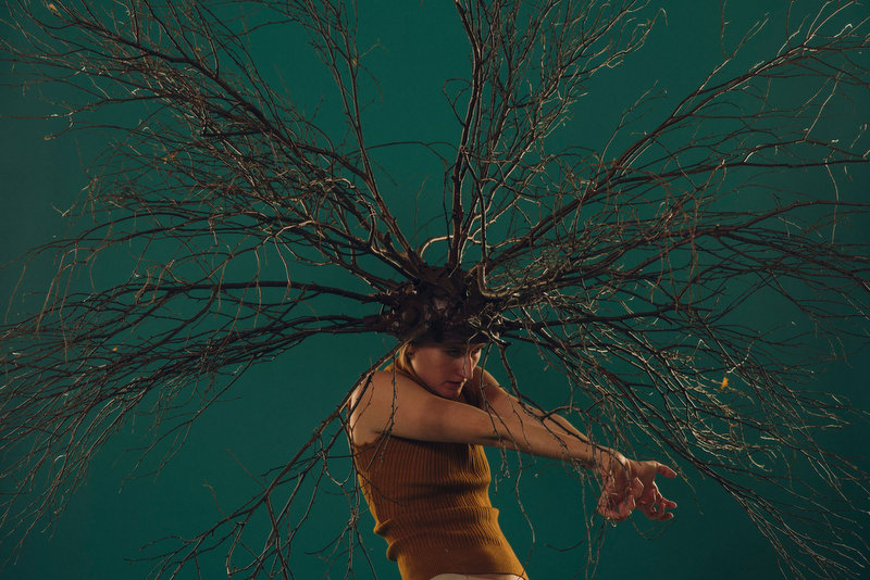 We meet Myrrha (Julie Koenig) after the transformation has already taken place, with branches projecting from a headdress. She stands motionless centre stage, high on a pedestal. She slowly rotates, watching the world pass by before she climbs down from her plinth onto the floor below. The performance delves into the world of the myth through dance, music and spoken word.