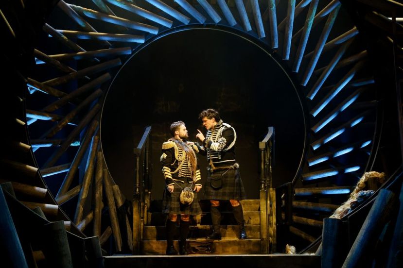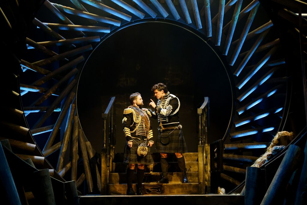 Niall McKeever’s set design is striking and immersive, all tree trunks, staircases and tiny houses which create an all-seeing eye watching over the proceedings. Kevin Treacy’s stunning lighting along with Russell Goldsmith’s innovative sound design complement the set, conjuring up flying beans, a marauding giant and attacking birds with striking ease. The set does limit the physical action to some extent, and at times the static staging leads to pacing issues, particularly in Act One.