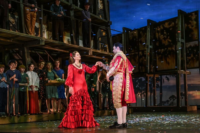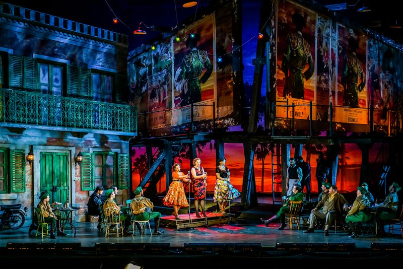 But enough of its history. What of this production? Firstly, this is a long-delayed production of Carmen that was cancelled in March 2020 due to Covid. As such, there was a great sense of anticipation in the auditorium from an audience long starved of such musical delights. This is a co-production between Irish National Opera, Opera Philadelphia and Seattle Opera, sung in French with English surtitles and running for three more performances on the 9th, 11th and 13th of March at the Bord Gáis Theatre, Dublin. As an opera, it has been set in many different time periods over the years and this particular temporal setting was the 1950’s with costumes appropriate to the period including swing & pencil/wriggle dresses for the women and jeans/leather jackets for the men. The set was large, complex and colourful, and I particularly liked the factory setting in Act 3 which had a magnificent trompe l’oeil run of factory windows shrinking into the distance in the nighttime light. Distant palm trees in the background throughout reminded us of the sultry Spanish setting.