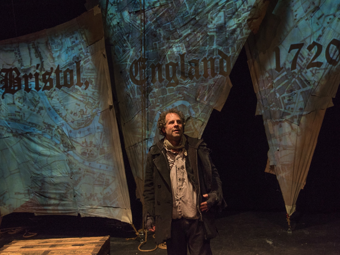 The set appears initially like the interior decorators have been in, with a collection of ladders on stage and large white sheets on the ground. At the start of the show, the stage is plunged into complete darkness. Our main protagonist arrives on stage with only the light from his mobile phone to guide his way. He then manages to find a switch that illuminates the stage. In the early part of the piece, we hear our Mariner is over 300 years old, kept alive by the spirits above to travel the world and tell his tale to all who will listen. The Mariner drapes the sheets between the ladders, which form screens for the various projections and our tale begins in earnest. These projections set the scene, with images of old taverns, boats and the endless sea. The early part of the story starts in Bristol in the 18th century, before the Mariner is tricked into taking part in the doomed voyage.