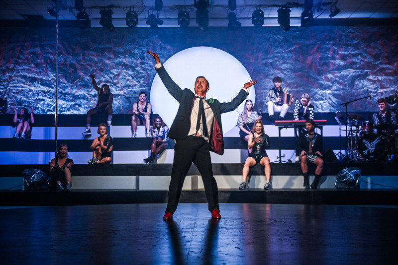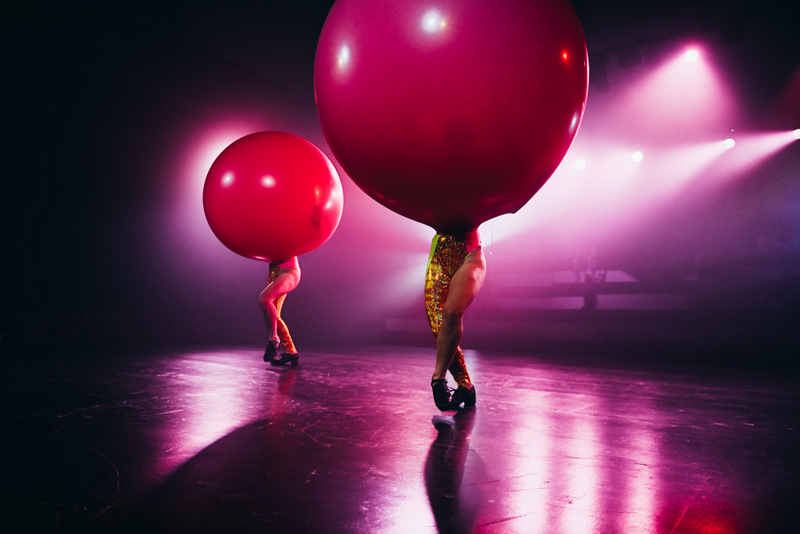 The production is mainly dance based with a number of different teams of dancers. While Philip Connaughton was responsible for the choreography of the piece, he is also one of the main practitioners. He emerges on stage like a drunk, late night at a wedding, wearing a black suit and stumbling around the set, before taking his place centre stage for a song (I Wanna Be Seduced by Mary Coughlan) along with a minor, flirtatious striptease. He also featured in one of the more unusual pieces, as two dancers perform alongside and later inside two large red balloons.