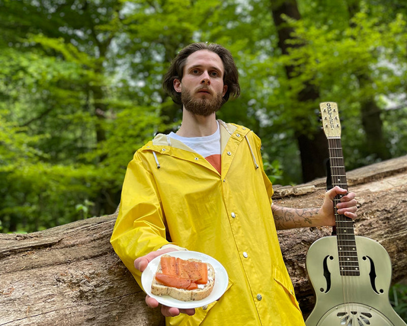 James Ireland (pronouns they/them) sits behind a table on which there is a chopping board, a knife, various small jars of herbs and spices and bottles of sauces. They begin by going to stage left and washing in a bowl of water their hands carefully. They talk with great enthusiasm of their favourite spot in the Wicklow mountains which is far away from the city. They explain that humans were hunters and gatherers but we “hunted our food off the face of the earth”. We then created agriculture but we are “making another catastrophe now”. It is against this backdrop they cook, with meticulous care, the vegan salmon of knowledge.
