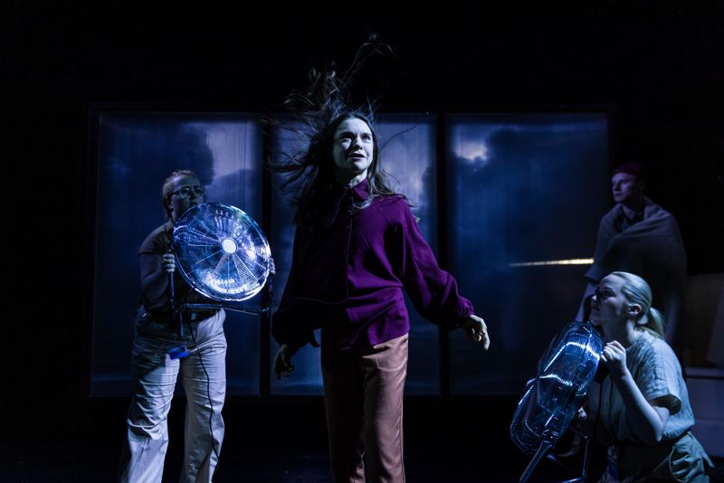 The main role in this production is played by Venetia Bowe and she is hugely impressive, often playing both Lear and Cordelia in the same scene! She holds the various strands together with her high-energy performance as the veteran actor Joy and is enjoyable throughout. Peter Daly plays Joy’s estranged son Conor. He moves from an innocent child to a bitter middle-aged man over the course of the piece. Manus Halligan has a casual style on stage that few could replicate, and he does well as Liam. While the plot is interesting, the style and inventive delivery are what elevate this production above many others. It is a visual feast and the actors really embrace this high-concept piece.