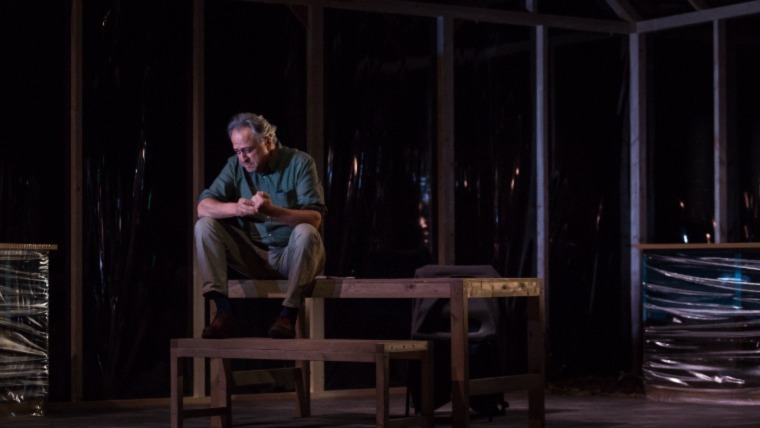 The stage by Zia Bergin-Holly gives the impression of a modern glass structure with a high ceiling, allowing the viewer to see the coastline behind. The few pieces of furniture on stage create space for Townsend to prowl the stage, as he dominates his terrain.