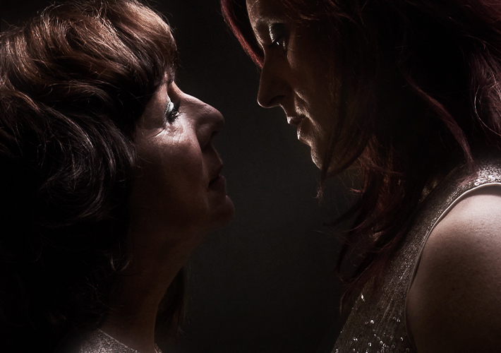 When the piece starts in earnest, we are introduced to the other star of the production; Helen Jordan. As Philip describes her, she is a ‘hoofer’. A singer/ dancer who has been in constant work throughout the years at all levels of the entertainment business. She once sang at the Eurovision and almost met Sinatra! She is someone that has lived for the stage and is addicted to the drug of performance. She sings a song with a touch of Las Vegas in the air, as her team of dancers perform by her side. A banner drops from the ceiling, giving the audience the lyrics, allowing us to sing along!