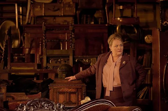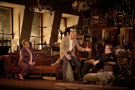 The play is set in an old apartment, packed with far too much furniture. It is the detritus of a once well-off family now packed into a small space. The set (by Stuart Marshall) is a carefully crafted space, allowing the actors to move while still giving an air of congestion and overcrowding. The lighting by James McFetridge allows light to stream in from the windows at one side of the stage, giving the impression that the events take place at dusk.