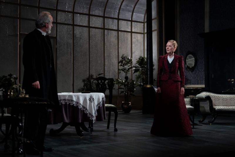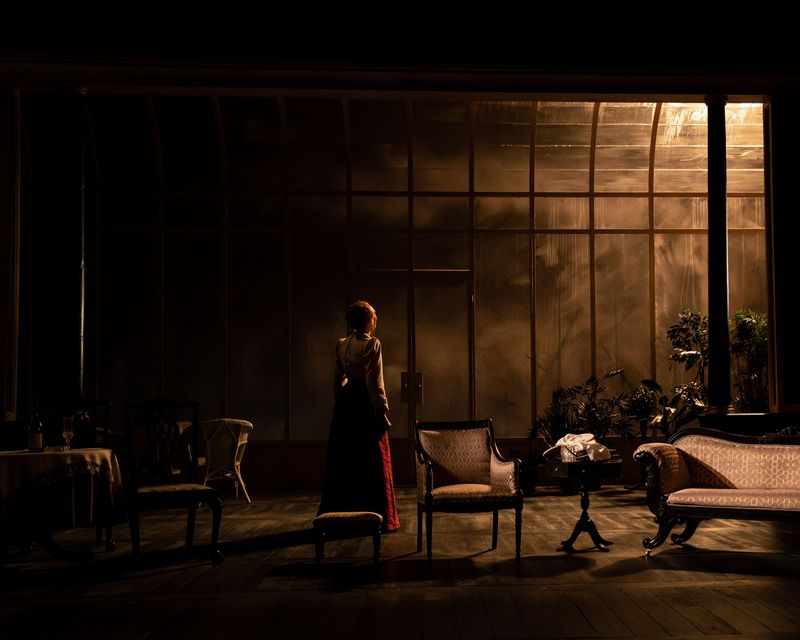 The setting for the play, created by set designer Francis O’Connor, is the sitting room and sunroom of the Alving household. There are doors on either side of the stage, as well as the doors of the sunroom, to allow movement on all sides. The wall of glass at the back of the set allows for occasional dramatic lighting by Lighting Designer Sinéad McKenna.