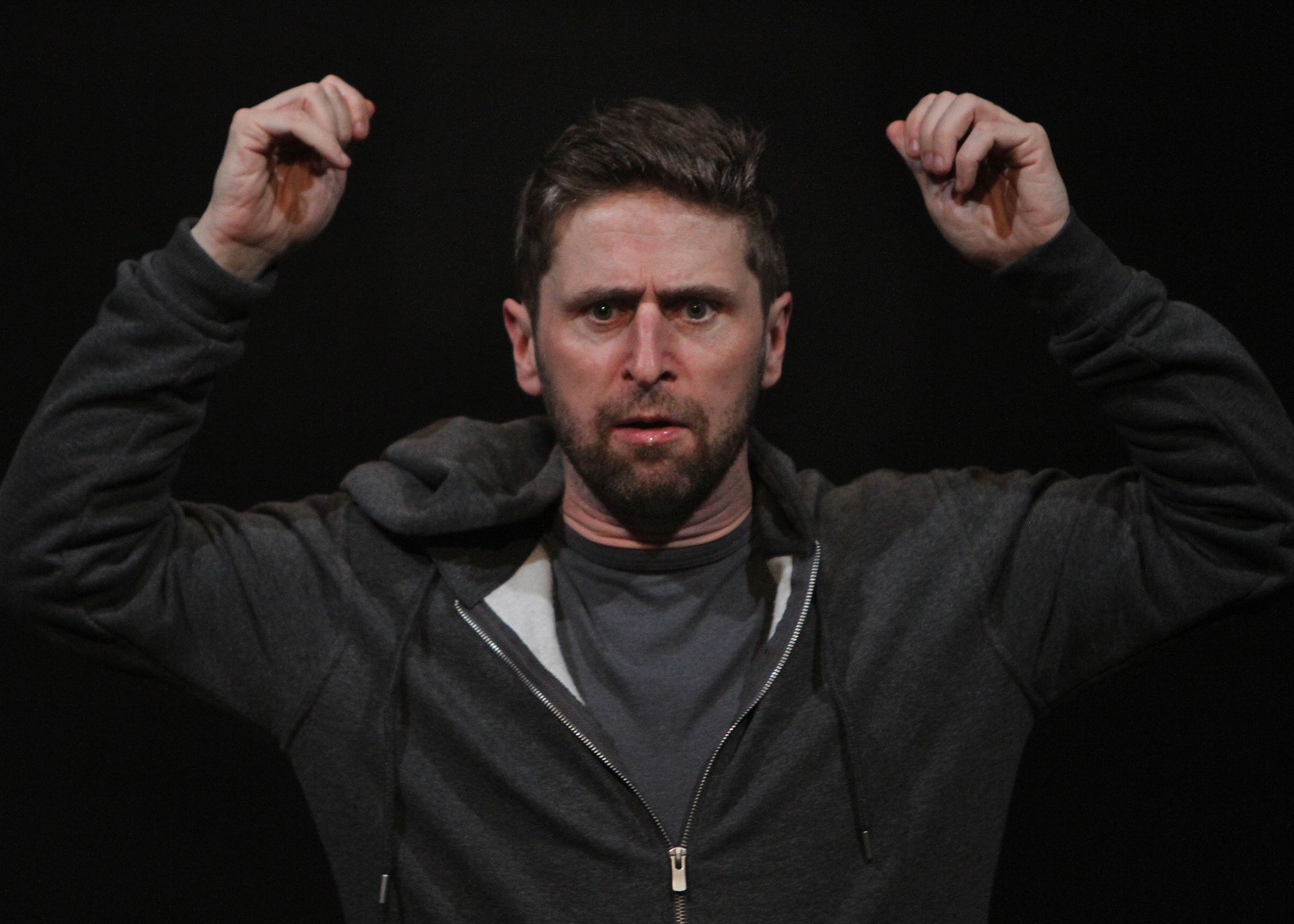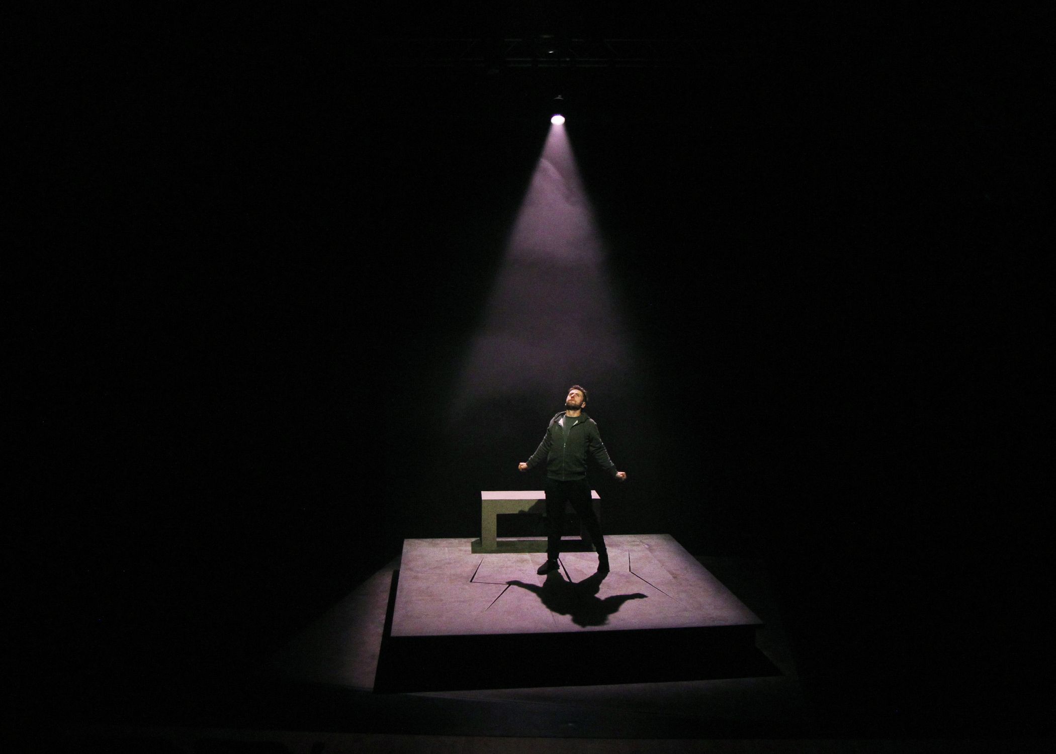 The set is simple being a grey raised rectangle on which a grey bench rests. Monaghan is alone on stage throughout. He is joined by fifteen other characters through voiceovers, which include his wife, Declan his nemesis and a panoply of other personalities who make up the community in which he lives. In that community, the GAA plays a prominent role and he was once a star of the sport. Given what he considers his diminished status, he is now searching for his role – to be a superhero or given his location a super-bogger.