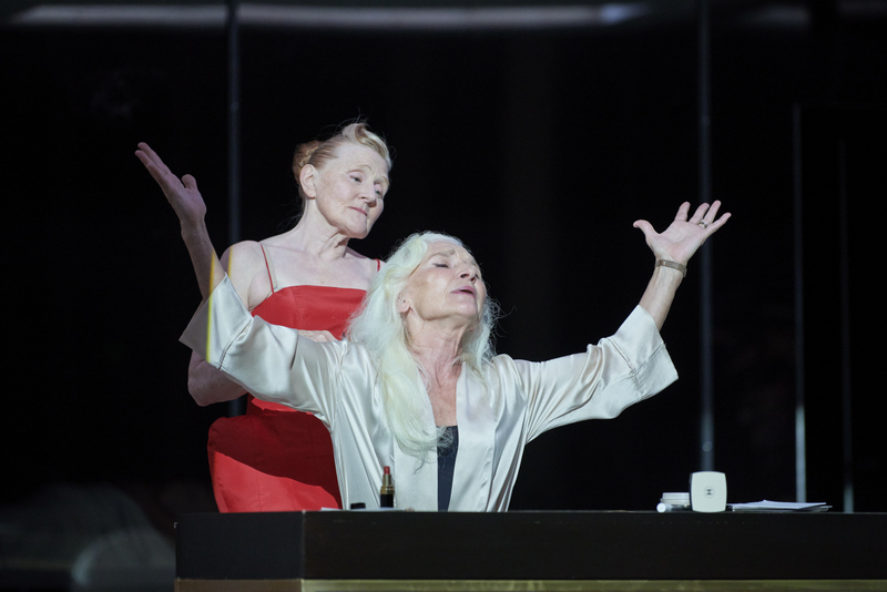 In this space, the First Lady (Olwen Fouere) reigns. It is her domain even though her husband the President (Hugo Weaving) is in a neighbouring room, attending to his ablutions and getting a massage. Appropriate noises of water can be heard intermittently. The First Lady has a maid, Mrs. Frolick (Julie Forsyth), who is at her every beck and call. Mrs. Frolick is on stage for a large portion of the first Act but has only one or two lines to speak. She carries out a variety of manual and menial tasks mostly in silence. Meanwhile, the First Lady reveals her fears of the assassination of herself or her husband, the terrifying path their son has chosen and the death of her pet dog who died of a heart attack in her arms in unusual circumstances. Her self-obsession knows no bounds. Fouere keeps up a terrific pace and all is spoken at full throttle. Comic light relief is provided by Forsyth whose scurrying movements and facial passivity are a masterclass in how almost no lines can still be used to create a substantial stage presence. The act lasts approximately an hour and a quarter and the intensity of the First Lady’s fears and skewed values creates a sense of exhausted bewilderment in the viewer.
