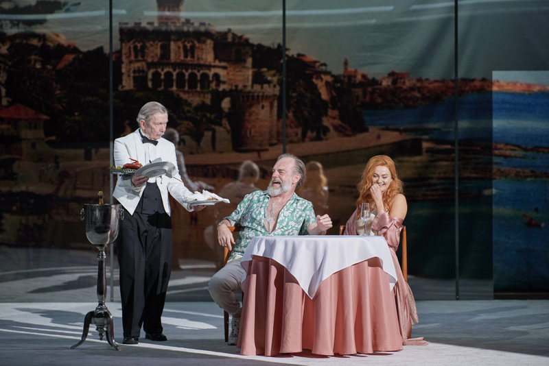 The second Act takes place in a luxury hotel in Estoril. The backdrop is a coastal habitation of charm and ease. Here the President is entertaining a young actress (Kate Gilmore) to champagne al fresco on a terrace with a splendid view. He too like his wife is self-obsessed as he explains to his young admirer the means by which he rose from nothing to this all-powerful political position but it is not enough for him. He has regrets that he had not achieved it in a larger country. Weaving is magnificent as he engages with the young actress. He equates her path to becoming a world-famous actress with his own career as a politician. His copious drinking unleashes his old man’s desire to fondle the actress’s more youthful flesh. It is meticulously executed by Weaving. Again like Mrs. Frolick the young actress has almost nothing to say. Her role is to simper and shrewdly comply with the President’s whims as they drink. Gilmore managed through eye gestures to show that the actress understood her role but that she also has an understanding of how to handle the President. There is also a collection of other small roles nearly all silent and these were well executed. In this regard, Daniel Reardon’s waiter was a little gem.