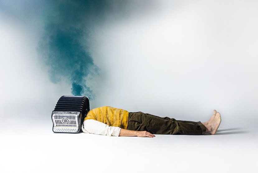 By use of their very varied skills and aptitudes O’Mahony, Keegan and Roddy keep this somewhat wacky but innovative piece firmly on track. O’Mahony, magnificent accordionist that he is, is a joy to listen to as he plays but his comic timing and delivery in the opening sequence with Keegan shows that he has more than a one-trick pony. The piece rightly lauds the accordion as an integral part of Irish traditional music. On a more general level, it explains there is a time span to each person’s artistic endeavour. Each artist has to deal with that reality which is a challenge. These three artists however are still at the height of their powers and their collaboration to create this engaging piece of theatre enhances each of them.