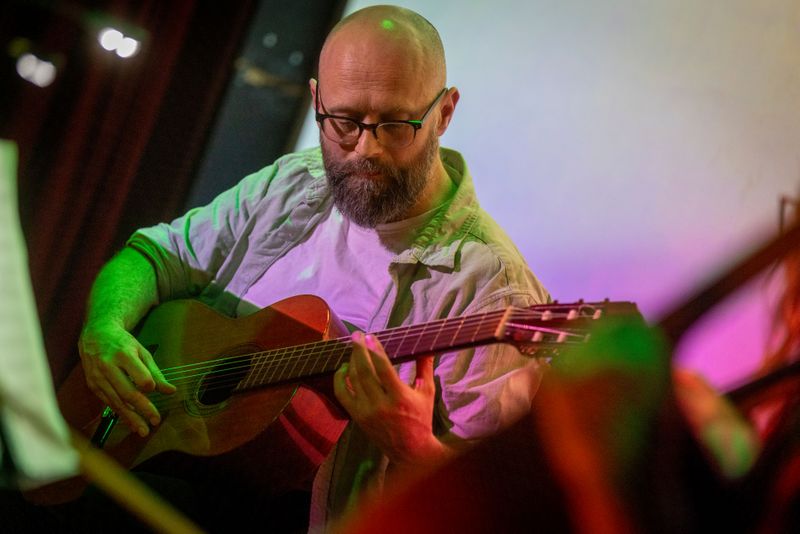 John Lambert was joined by Barry O’Halpin from the Crash Ensemble on guitar and Lioba Petrie and Mary Barnecutt on cello. They opened with some selections from his new album Souvenir. Koyo and The Art of Friendship were, if anything, enhanced by the addition of cello. Lambert played Red Admiral solo and it was a joy to listen to him handle the intricate guitar patterns. The set wasn’t only new material, Lambert and O’Halpin played a medley of older tracks, Leaf to Light and in particular a haunting 20th Century Artillery.