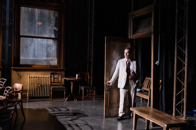 The play is firmly set in one room, with the 12 jury members sitting and standing around a large wooden table. There are windows at the back of the set and doors leading out on either side. It’s a simple set but highly effective at establishing the time and place.