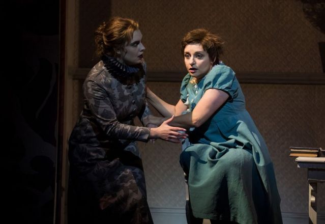 The set was simple and effective with tightening sightlines introducing a sense of menace from the start. The walls had an oversized purple pattern reminiscent of (to this writer anyway!) 1970s vintage flocked velour wallpaper, which was carried into the matching Renaissance-inspired costumes of the chorus. Secret doors in the walls enabled characters to move freely around the stage and effective interior scenes slid onstage left and right as required. Portable lamps were used to great effect at various stages.