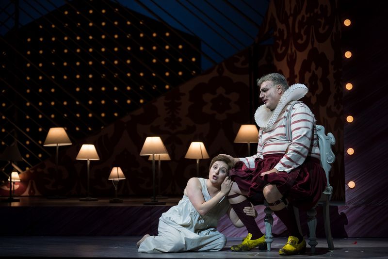 The set was simple and effective with tightening sightlines introducing a sense of menace from the start. The walls had an oversized purple pattern reminiscent of (to this writer anyway!) 1970s vintage flocked velour wallpaper, which was carried into the matching Renaissance-inspired costumes of the chorus. Secret doors in the walls enabled characters to move freely around the stage and effective interior scenes slid onstage left and right as required. Portable lamps were used to great effect at various stages.