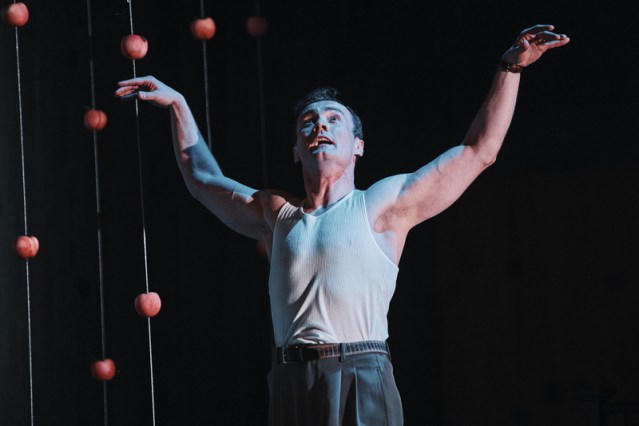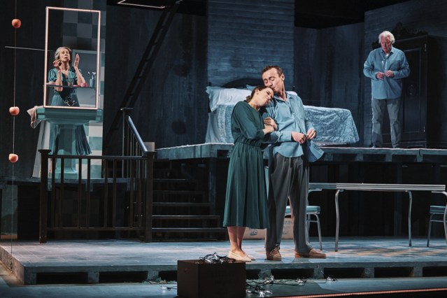 The stage by Francis O’Connor gives us a kitchen table and chairs, along with a bed on a raised platform at the rear of the stage. Their garden has a peach tree, and to create this, many peaches hang from strings coming from the ceiling. These peaches extend out into the auditorium, over the heads of the audience.