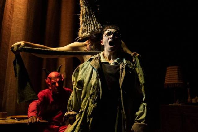 The production is stylish, with its moody lighting and moments of eerie calm, as the drones of Lankum play out in the background. The costumes are playful, with the creatures of the Tuatha Dé Danann emerging from the other world to dance and play on this Halloween night. These divine beings in Irish mythology stand tall against the diminutive Specky, looking like giants and filling the stage. The visuals are extremely strong, and the combination of Lighting Design (John Gunning), Set Design (Sabine Dargent) and Costumes (Darius Dolatyari-Dolatdoust and Constance Tabourgait) has created something quite sumptuous. The scenes of dance are when the production really comes to life and feel wild and irreverent, with chaotic pagan dances, as the stage films with these bizarre creatures.