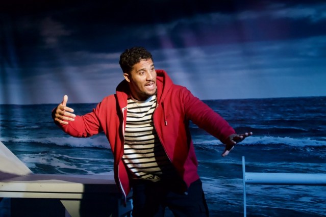 The backdrop to the stage is a blue sea. It looks benign, with gentle waves rolling safely to the shore, reflecting a blue sky and light clouds. But the sea has represented the biggest challenge to Ali (Randy Guine) in his life. He is thirty-four years old and has spent half of his life in Ireland, mostly in Dublin. He came to Ireland by sea with four Libyans and two Chinese in a container seventeen years ago. As he says, he is half Irish, but he is now being escorted by two private contractors to Rosslare to be deported by sea and train to Morocco, from where he came.