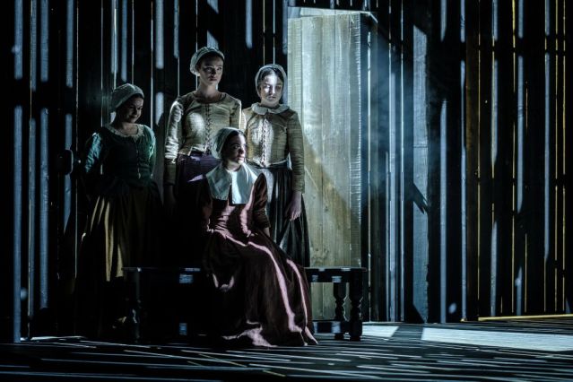 The set is predominantly black, and there is the occasional use of simple furniture appropriate to the late seventeenth century. The cast is all dressed in muted dark shades in attire typical of that time. It is a closed, God-fearing, church-going community that can see the work of the devil everywhere, particularly through his agents – witches. Once a rumour about a female starts that she is a witch, no matter how irrational, she is in danger of being denounced. Under such threats, confessions are made. In the hysteria that is generated, it becomes an epidemic of arrests, confessions and even executions.
