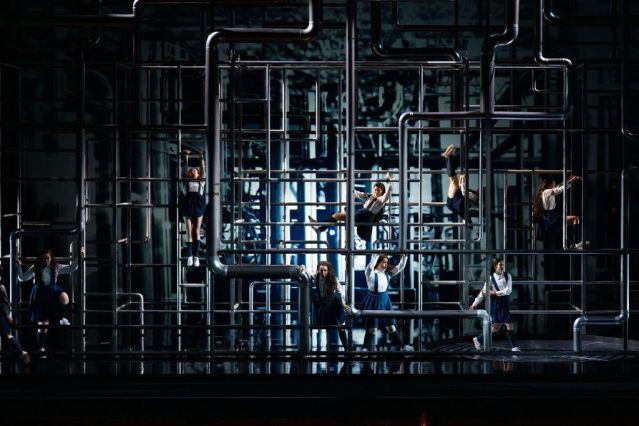 The staging is wonderful throughout the performance. At times, a transparent screen is used, permitting footage to be projected from both the front and back of the stage, which creates a 3D effect that makes the underwater scenes spellbinding. During the overture we see sunlight dappling the water from above and a long haired girl slowly swimming around, utterly at ease in that element, then heading down a tunnel to an underwater hall, like the engine room of a sunken liner, the home of Vodnik the water sprite (Croatian bass Ante Jerkunica), his daughter Rusalka (Irish soprano Jennifer Davis) and the other wood nymphs (soprano Rachel Croash and mezzo-sopranos Sarah Richmond and Alexandra Urquiola). When the screens rise, we see a similar huge scaffolding of pipes on stage with wood nymphs dressed like schoolgirls without a care in the world, moving acrobatically around the pipes in three dimensions. This is a stunning visual display accompanying the music.