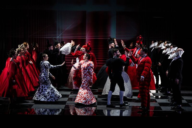For Act II, the setting is the Prince’s palace kitchens, all Michelin gleaming steel and chrome, busy with chefs working away. The Gamekeeper (baritone Benjamin Russell) hacks away at a carcass with footage of raw steaks on the backdrop – not one for the vegetarians! There was much humour in this section. The Prince is struggling with his mute love and enters the Foreign Princess (Soprano Giselle Allen), well able to bamboozle the naïve Prince. Then on to the Ball with the courtly dance, wonderfully depicted as an interlocking chess game with the superbly costumed chess pieces weaving in and out of each other’s spaces. Poor mute Rusalka, in a ridiculously bouffon wedding dress, is literally out of her element, a “fish out of water”. Her father, Vodnik, appears, and she rushes to him in tears. The Prince declares his love for the Foreign Princess and ends up rejected by both women.