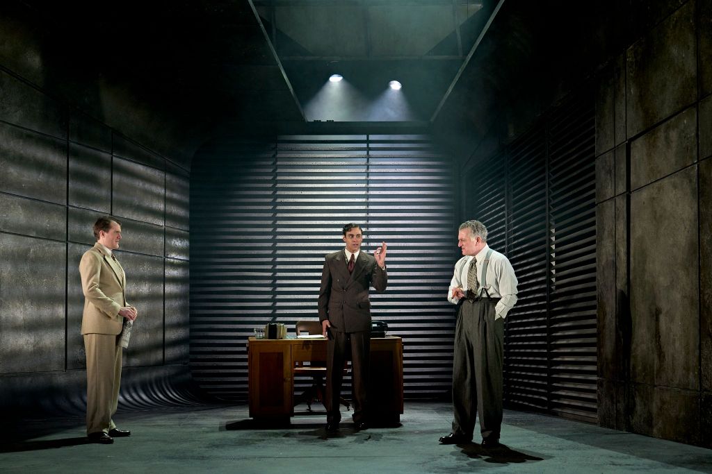 The set gives us grey, concrete walls with a slatted window on one side, which delivers an opportunity for interesting lighting effects. The piece is mainly set in offices and sitting rooms of the protagonists, and other furniture is wheeled on and off stage during the quick scene changes.